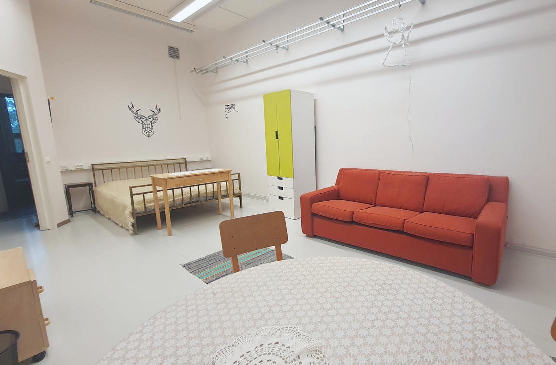 Opo-yksiön yhteydessä oleva tilava lisähuone, joka mahdollistaa perheen majoittumisen.