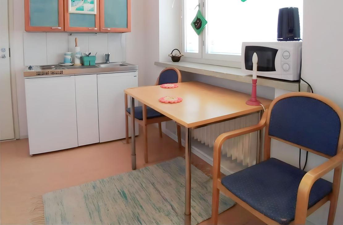 Pieni yhden hengen huone, jossa oma minikeittiö ja kylpyhuone.